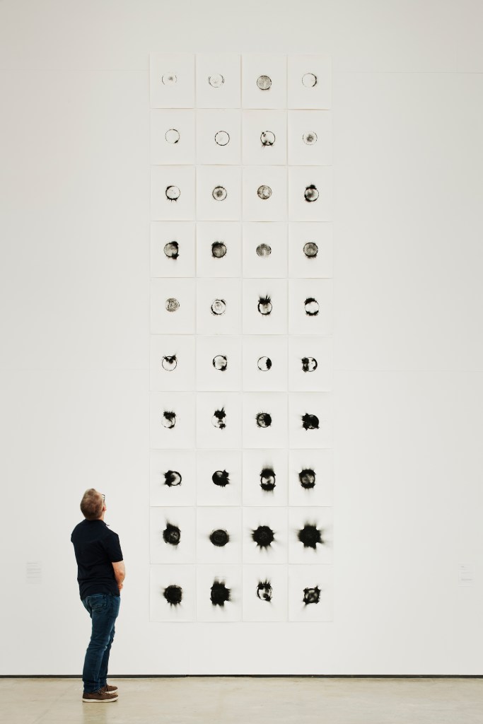 As part of this research I developed a process in order to visualise the sounds of a collapsing iceberg in the Arctic. The sound of a collapsing iceberg is a chilling reminder of our changing climate. The sharp, quick, and staccato rhythm of this sound, embodying the aggressive and explosive nature of an iceberg’s demise, guided the dance of the coal dust. As the sound reverberated, the coal dust was expelled in a burst onto the paper, creating unique patterns representing each second of the event, the end result is similar to a musical score.